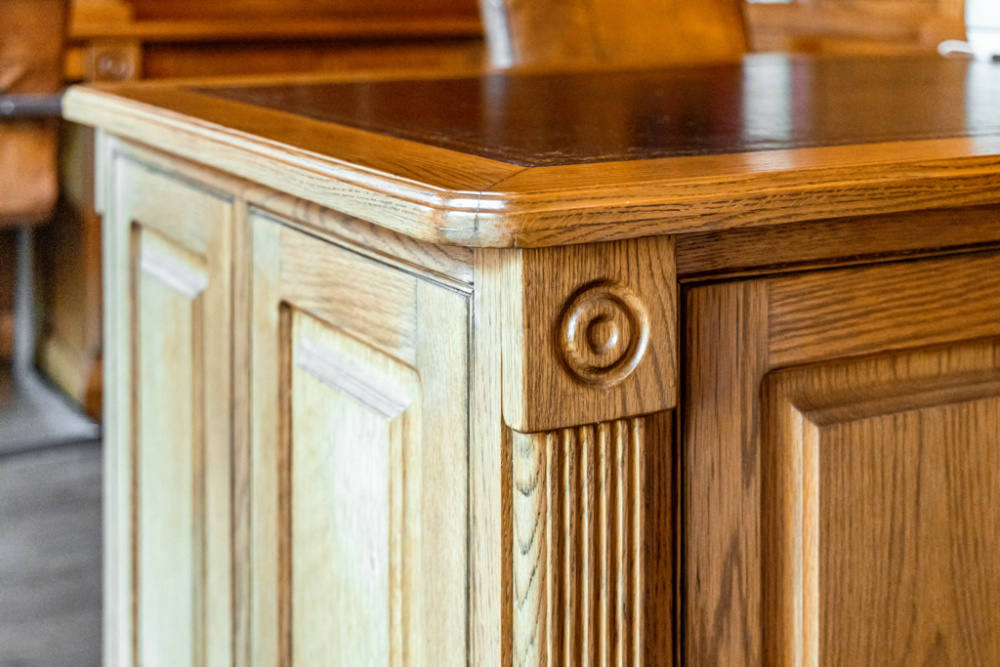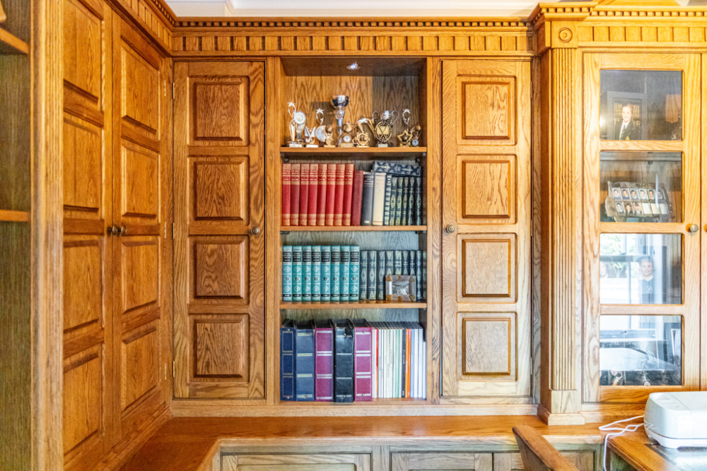Having fully fitted oak units comprising display bookcases, base units, full height cupboards, a range of drawers and fitted desk with 3 drawers.