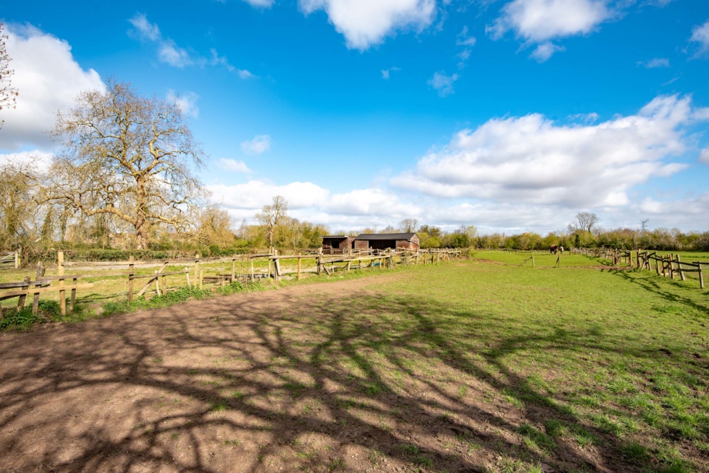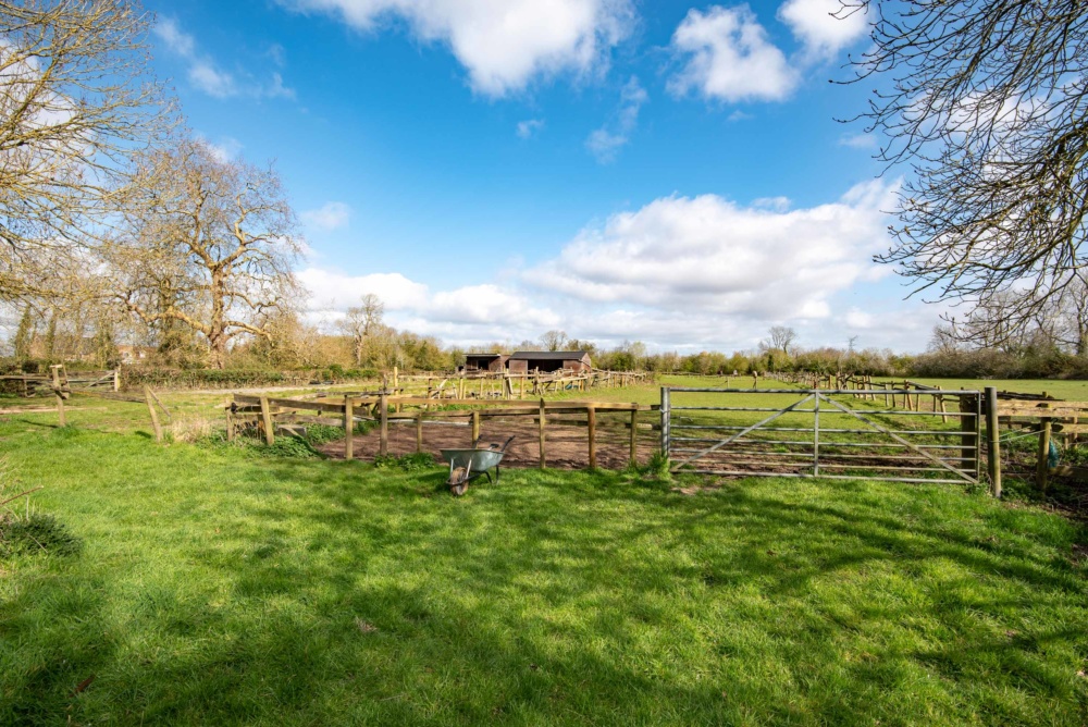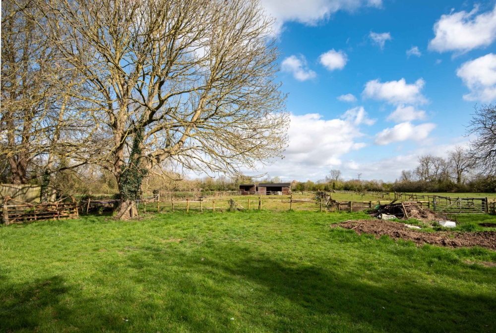 A gravelled driveway leads to the side of the house where there is a private garden to the house. A gated entrance leads into the field at the rear extending to around 5.1 acres in total, currently divided into a number of paddocks and ad hoc stables and a ménage.