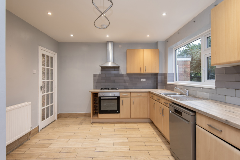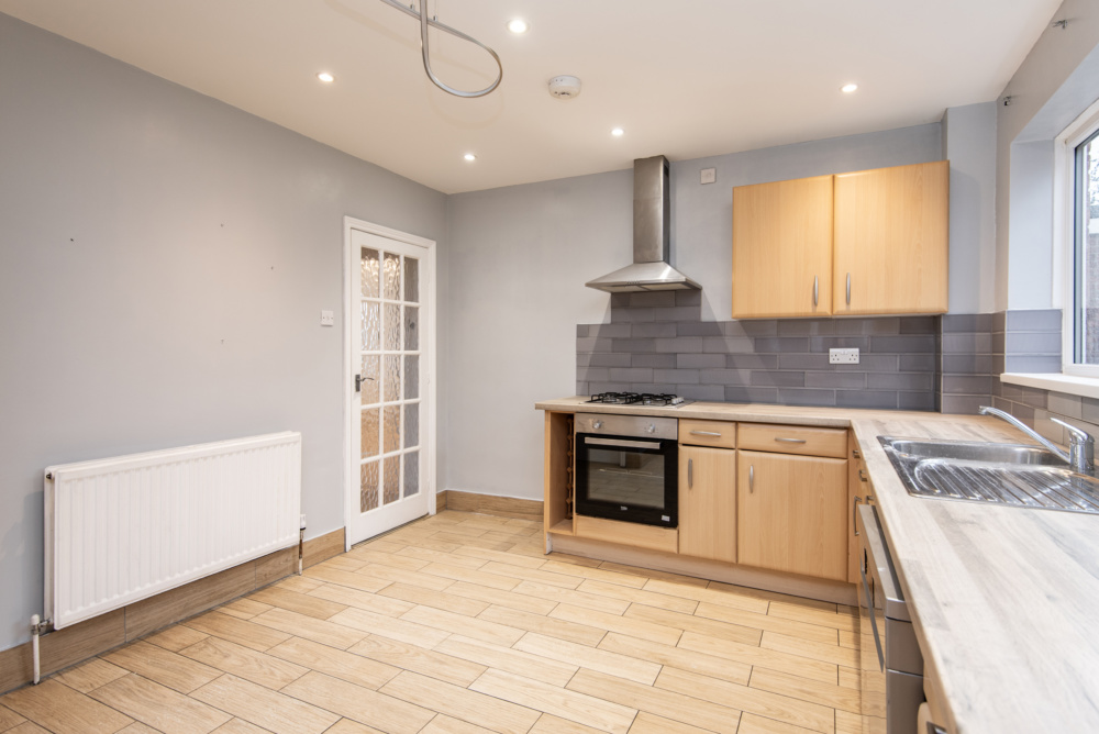 With a range of fitted base and wall units, integrated electric double oven, integrated gas hob, stainless steel sink unit, space and point for fridge, and storage cupboard housing central heating boiler.