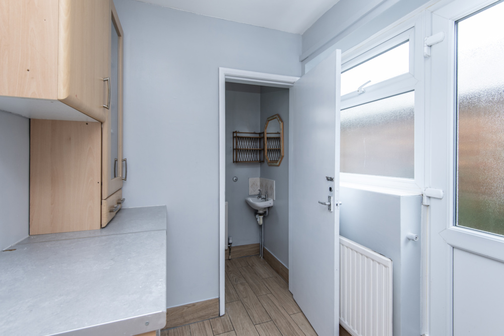 Plumbing for washing machine, space and vent for tumble dryer, radiator, door to side aspect.