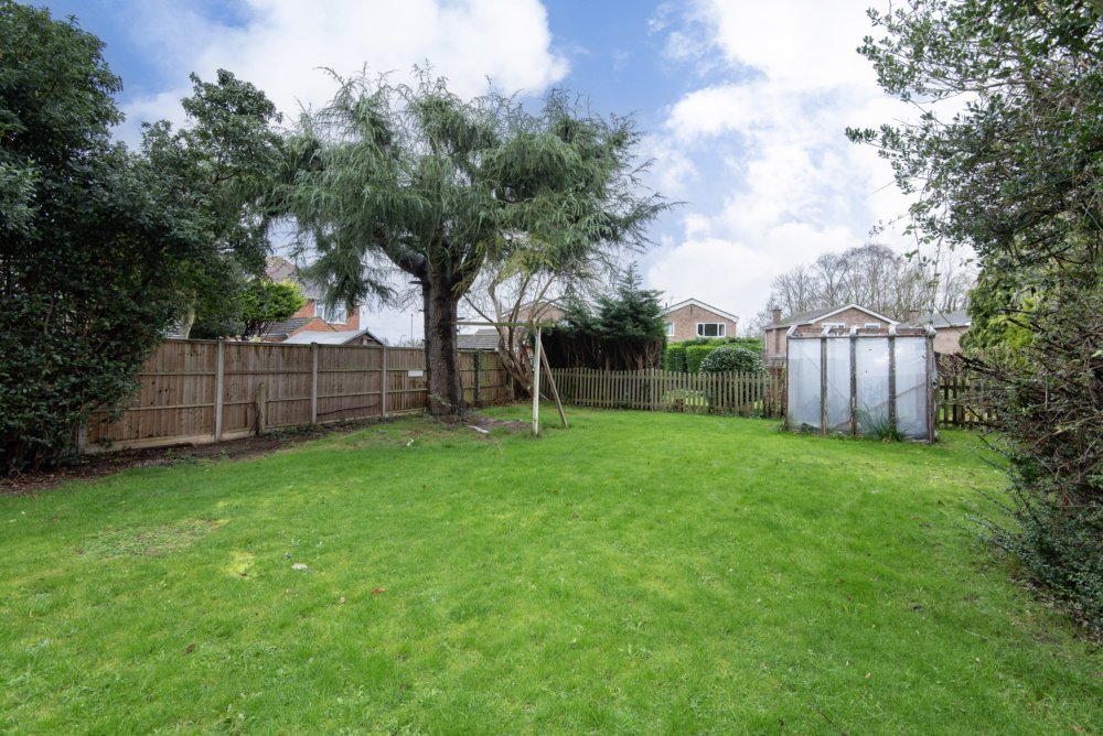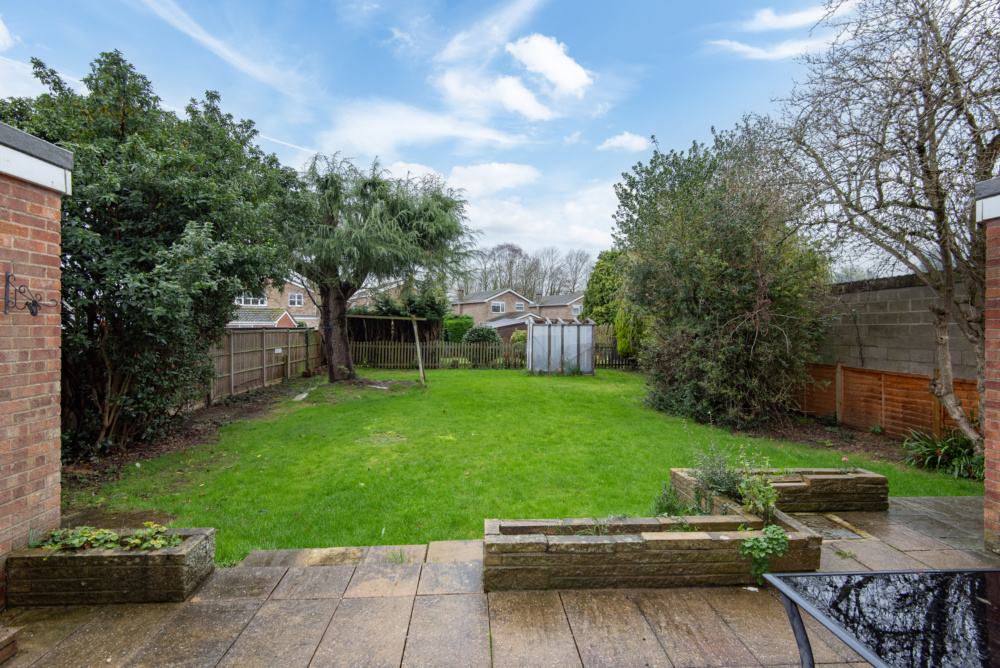 To the rear is patio and lawned garden with flower, plant and shrub borders