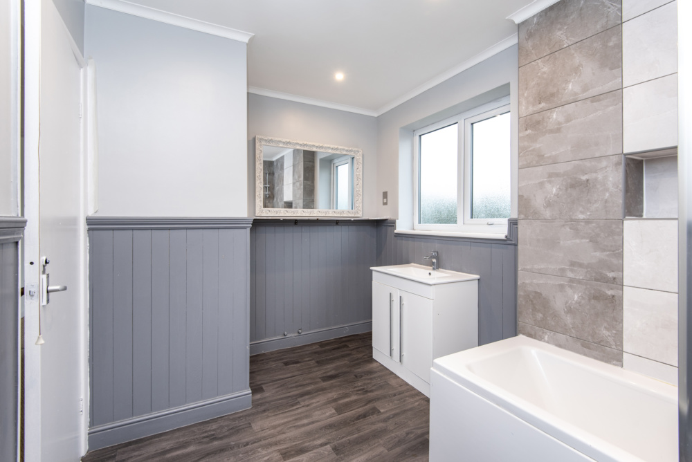 Suite comprising ‘P’ shaped bath with shower over, vanity wash hand basin, low level WC, radiator.