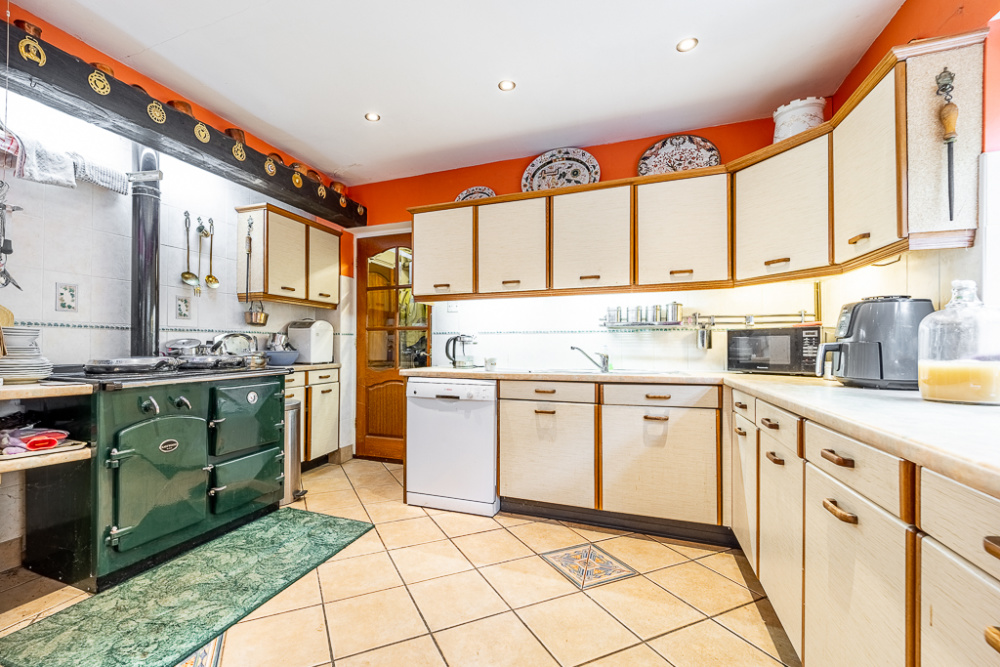 Having a range of fitted units, round edged worksurfaces with double stainless steel sink with drainer, additional storage units, Aga, tiled splashbacks, space for domestic appliances and doorway into conservatory.