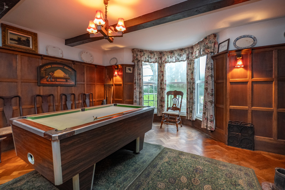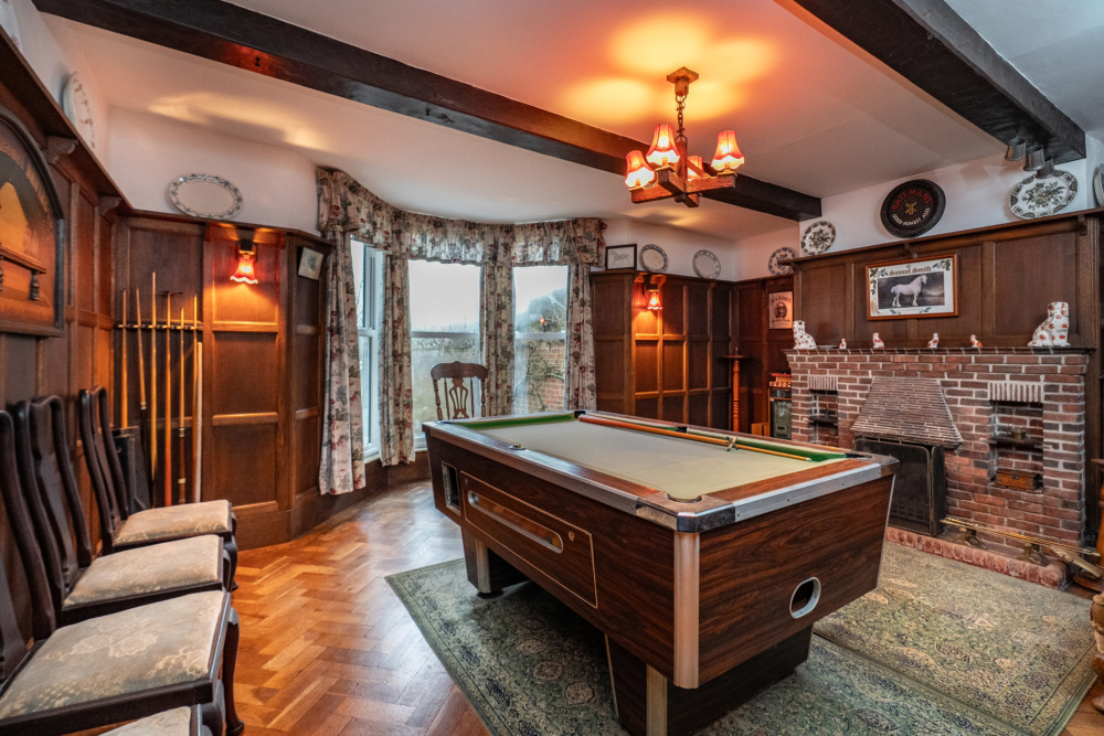 Having panelled walls, built in bar area, brick fireplace, herringbone floor, bespoke ceiling beams.
